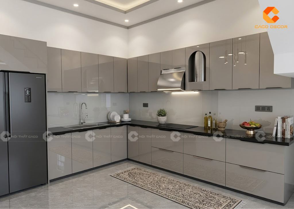 Thi công nội thất bếp nhà phố với tủ bếp Acrylic chữ L