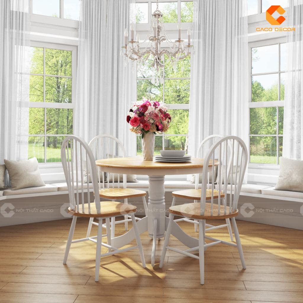 Chọn ghế ăn phối màu tương phản: ví dụ bàn trắng - ghế gỗ nâu hoặc ngược lại để tạo điểm nhấn hiện đại.