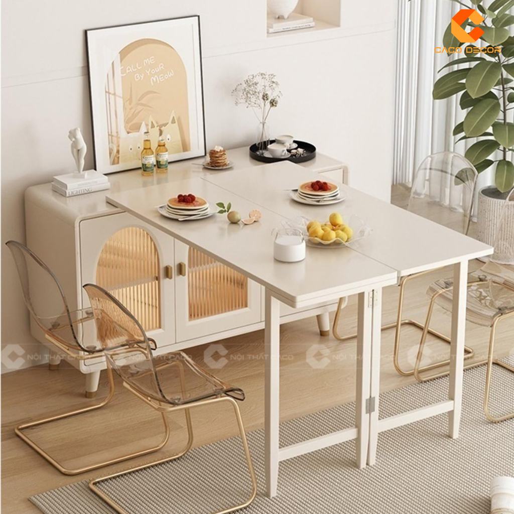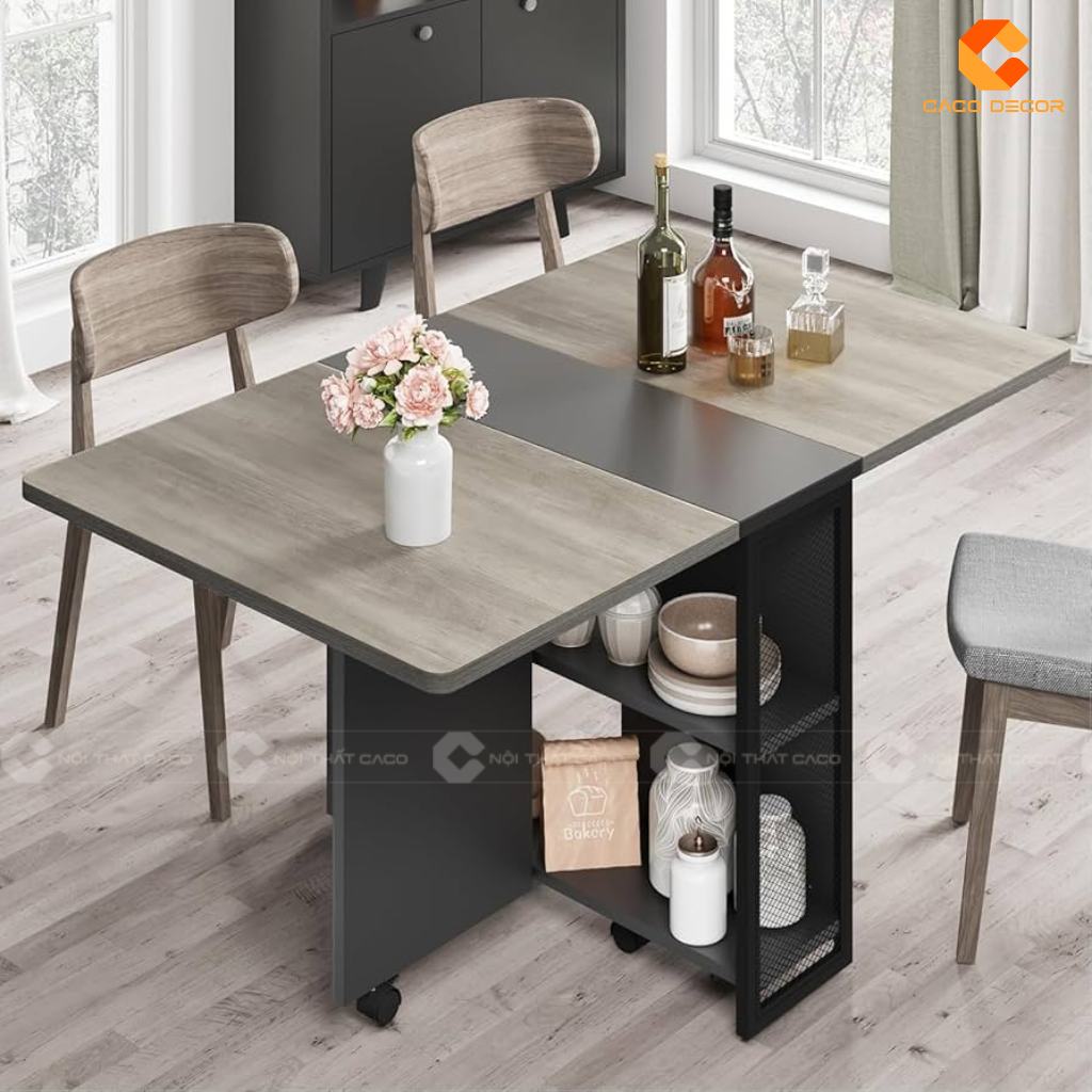 Nếu gia chủ sống trong căn hộ nhỏ hoặc studio, hãy cân nhắc bàn ăn thông minh gấp gọn. Mẫu bàn này có thể thu gọn khi không dùng, thậm chí tích hợp ngăn kéo chứa đồ tiện lợi. Một số thiết kế còn có bánh xe giúp di chuyển linh hoạt - rất phù hợp cho phong cách sống năng động của người trẻ.
