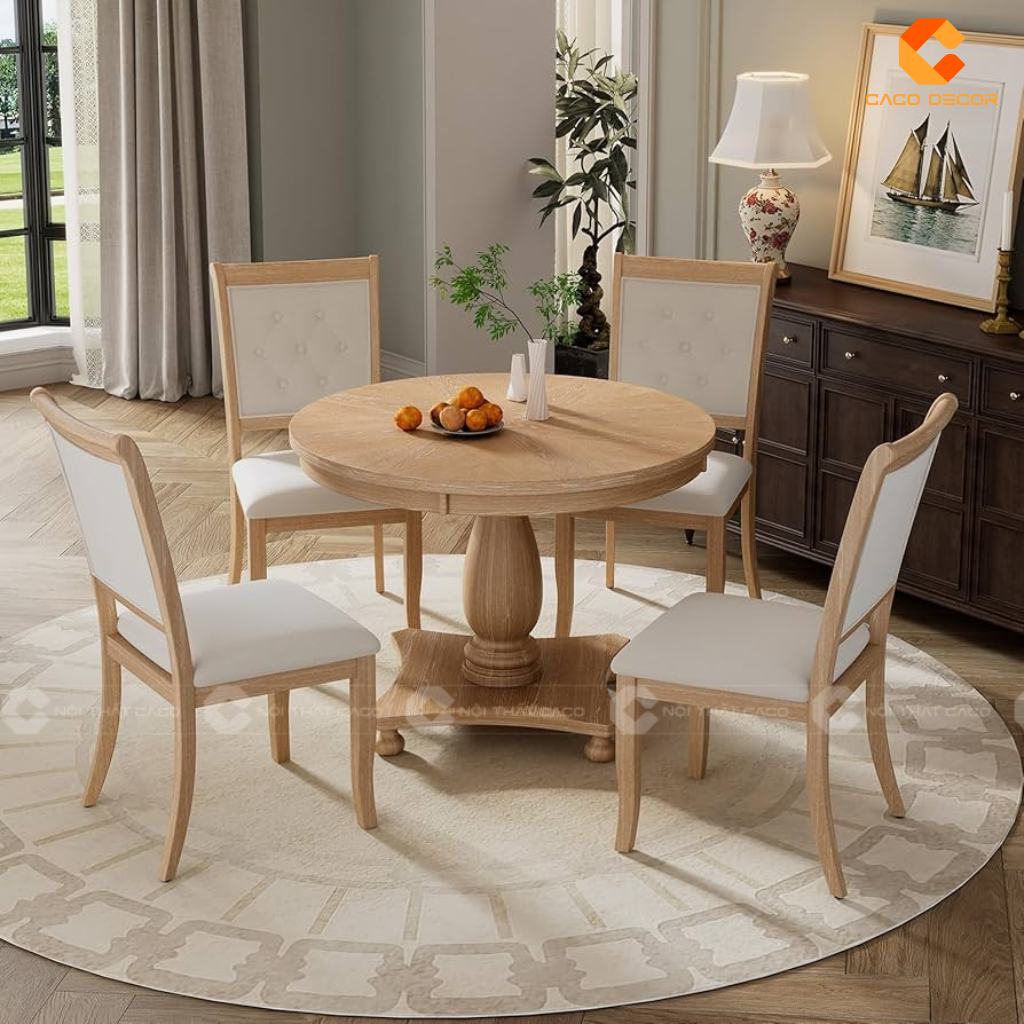 Đặc biệt, các mẫu bàn ăn gỗ tự nhiên phù hợp với căn hộ mang phong cách Bắc Âu hoặc tân cổ điển, có thể kết hợp cùng ghế bọc nệm để tăng thêm sự thoải mái.
