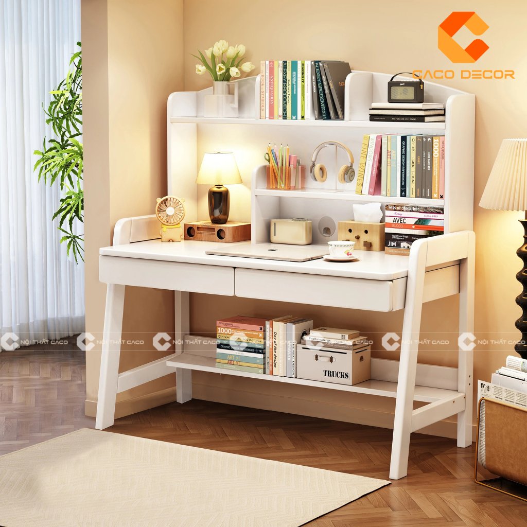 Mẫu bàn học gỗ được tích hợp sẵn giá sách phía trên hoặc bên cạnh bàn, rất tiện trong việc sắp xếp sách vở, truyện tranh hay các món đồ học tập. Chất liệu gỗ cao su giúp tổng thể bàn chắc chắn, an toàn và có tuổi thọ cao.