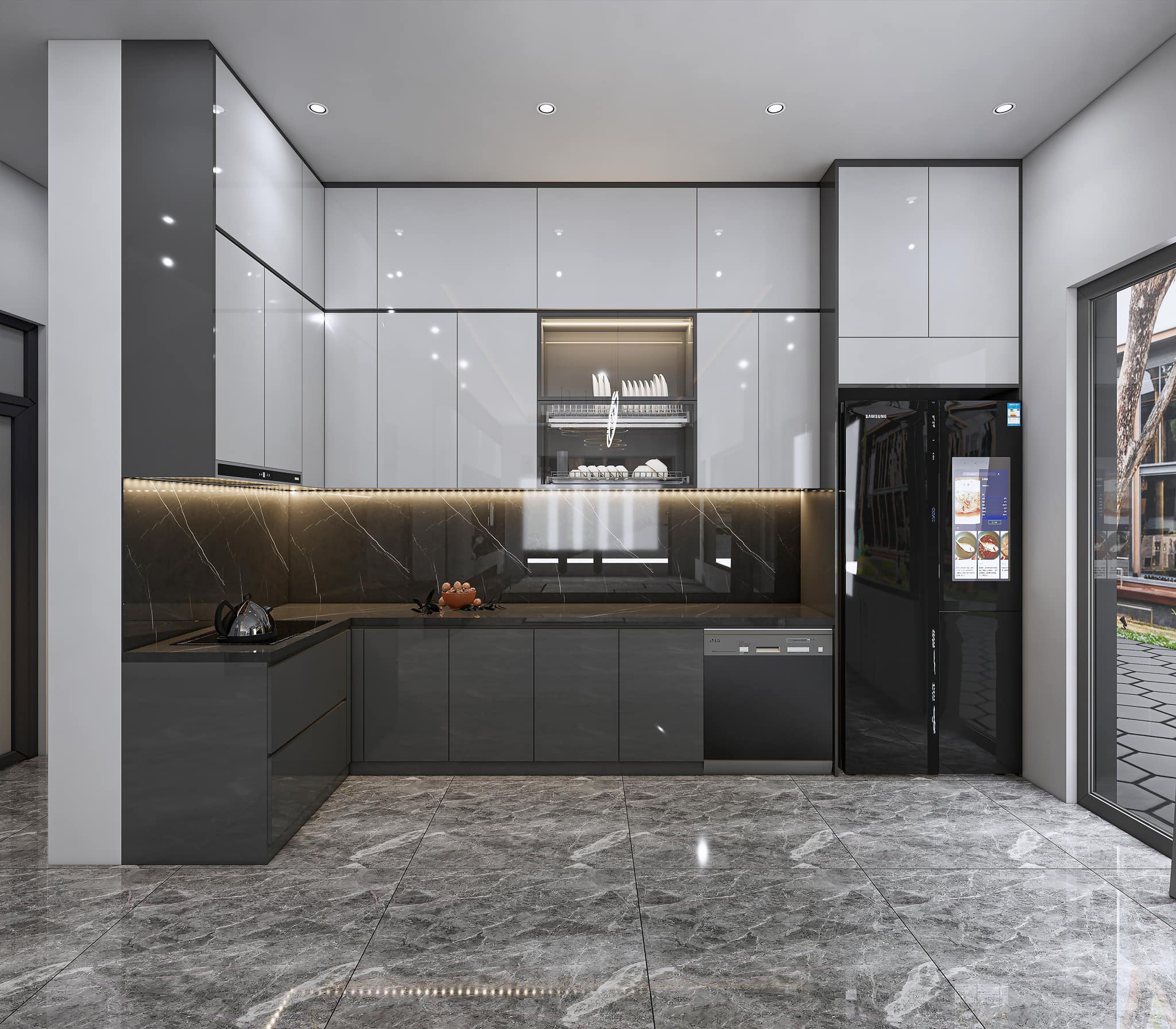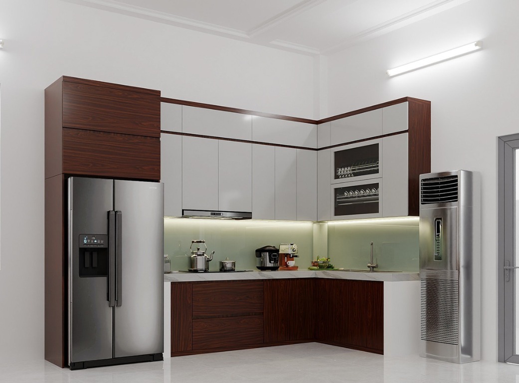 Thiết kế tủ chữ L là mẫu tủ gồm hai nhánh chạy dọc sát tường và kết nối với nhau tạo thành một góc vuông. Góc vuông của tủ sẽ được tận dụng và tối ưu góc chết một cách rất hiệu quả. Tủ bếp chữ L thường phổ biến đối với không gian bếp cho gia đình Việt, vì được phân chia khu vực rõ ràng, tạo thuận lợi cho quá trình sử dụng.