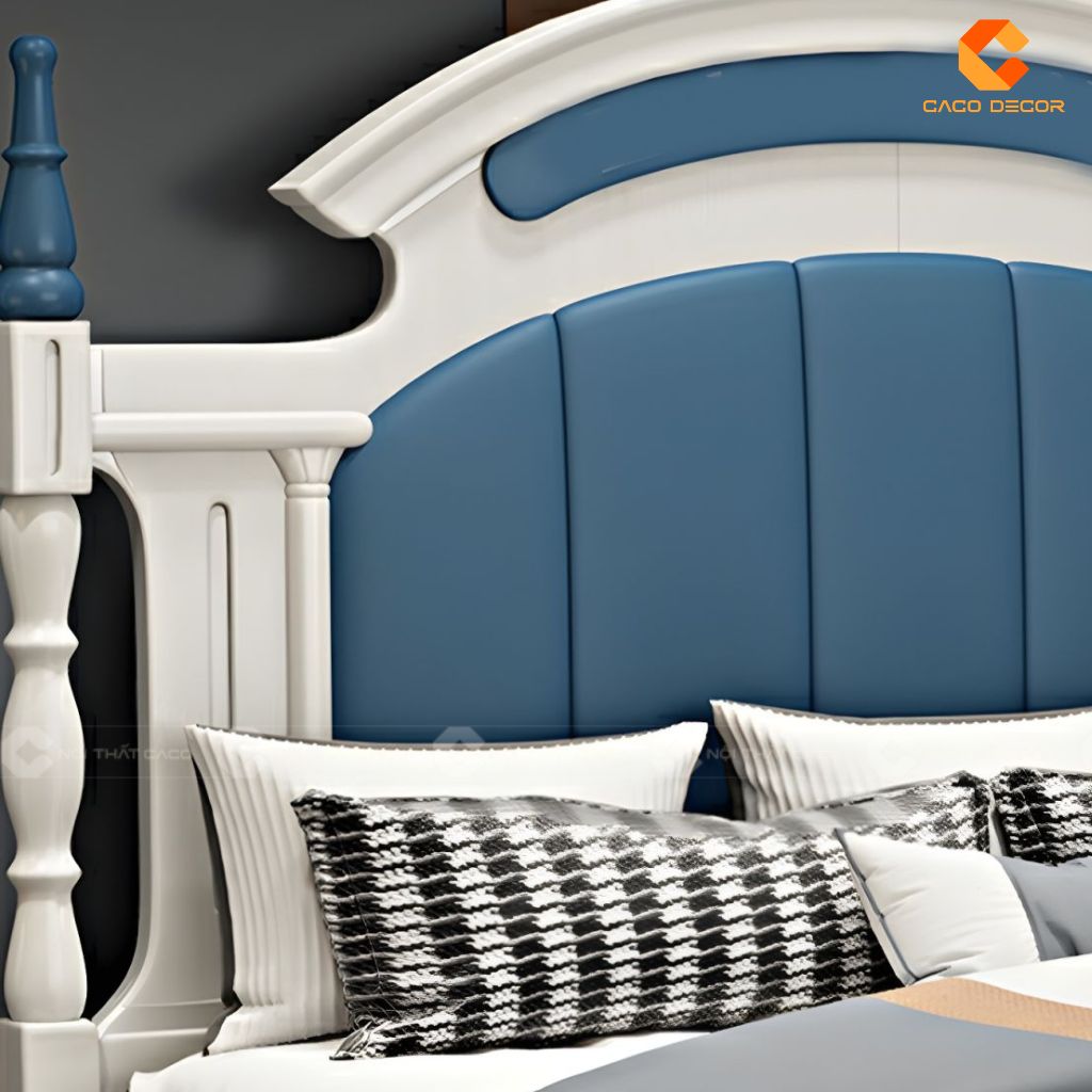 GNTE043 thu hút ánh nhìn ngay lập tức bởi cách phối màu Color Block đầy tinh tế. Trên nền khung giường màu trắng sáng, các chi tiết như đỉnh cột, viền đuôi giường và phần nệm đầu giường được nhấn bằng màu xanh dương đậm. Gam màu này không chỉ sạch sẽ, ít lộ vết bẩn mà còn mang lại cảm giác bình yên, giúp bé dễ dàng đi vào giấc ngủ sâu.
